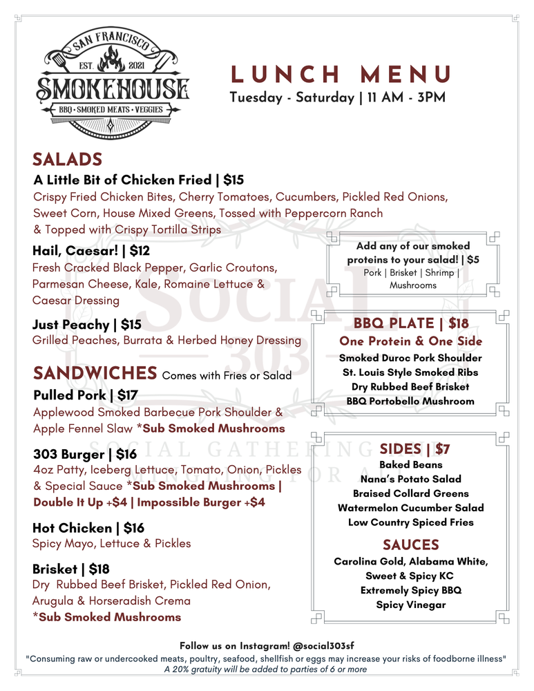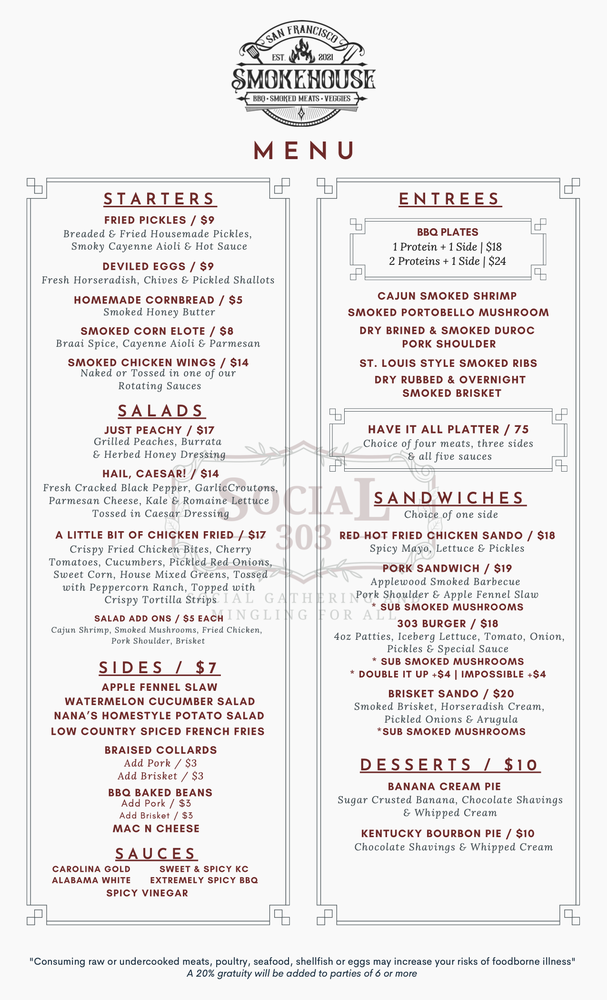 Welcome to Social 303, a dazzling gem located in the heart of San Francisco at 303 2nd St. This New American eatery boasts a menu brimming with vibrant flavors, where every dish tells a story. From the fresh 303 Caesar Salad to the mouthwatering Red Hot Chicken Sandwich, every bite is a testament to culinary craftsmanship.